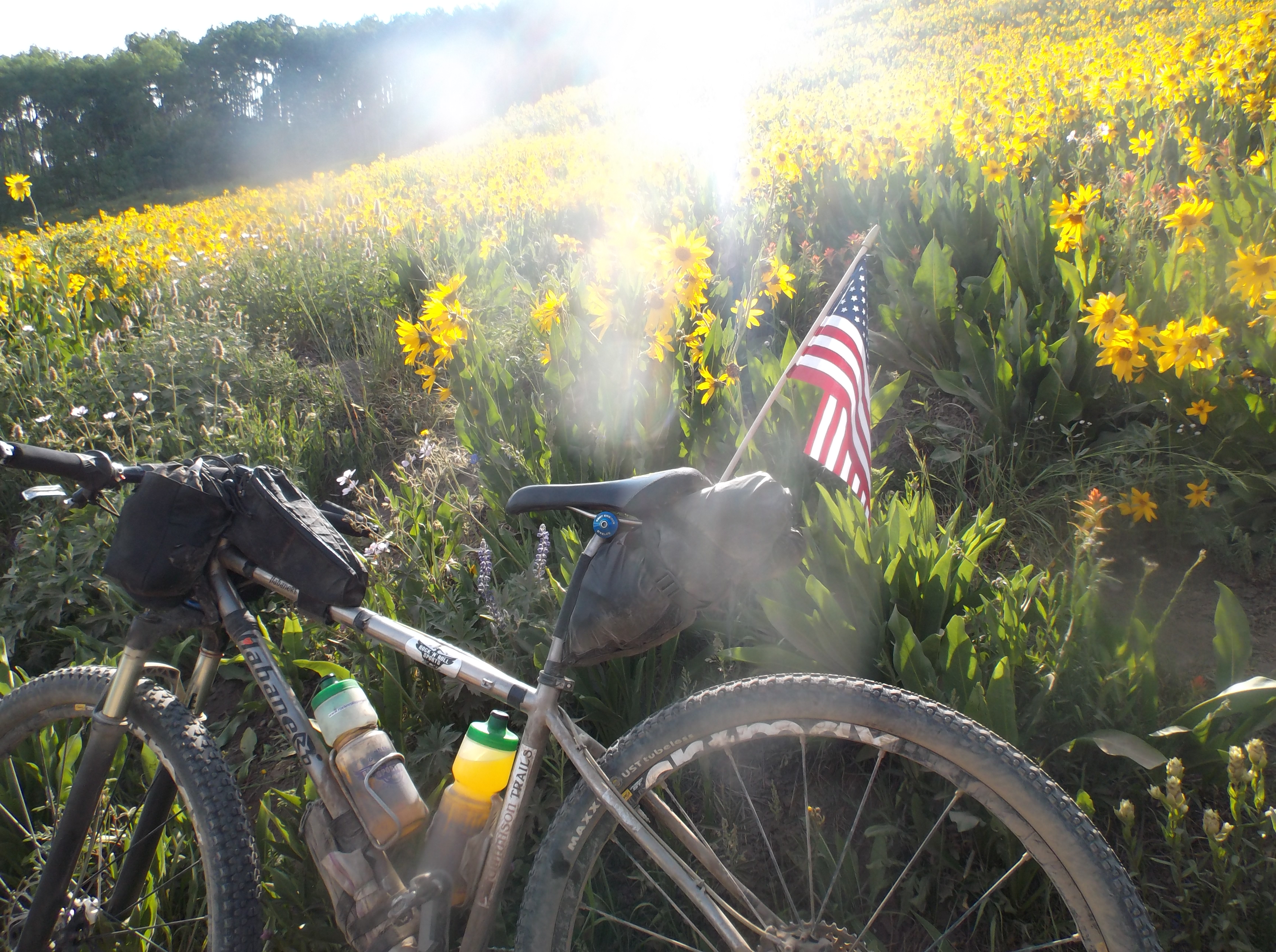 After a snack break in CB I head on home. I start the climb up Kebler finding a discarded Stars and Stripes laying in the road. I pick it up and stick it into my seatbag, “Happy Fourth of July!” I proclaim to myself. I get back on the bike and start climbing back up and over Kebler to Ohio Pass the same way I came into CB this morning. My legs are a bit empty, my bike is a dusty creaky mess, my bottom is sore, but the riding is still pleasant and the traffic is mellow. Cresting the top of Ohio Pass I am again blown away at how amazing the view is, the rows and rows of aspens below rolling up towards the delicate Castles of Mill Creek and the seemingly far away silhouette of mighty Sawtooth Mountain to the south. All have attached memories, adventures, experiences, all pull me to come back for more. From here, in this moment it is hard to see the frustration that ruled me just days before, blinded me to the possibility of this day, the chance for this perspective.