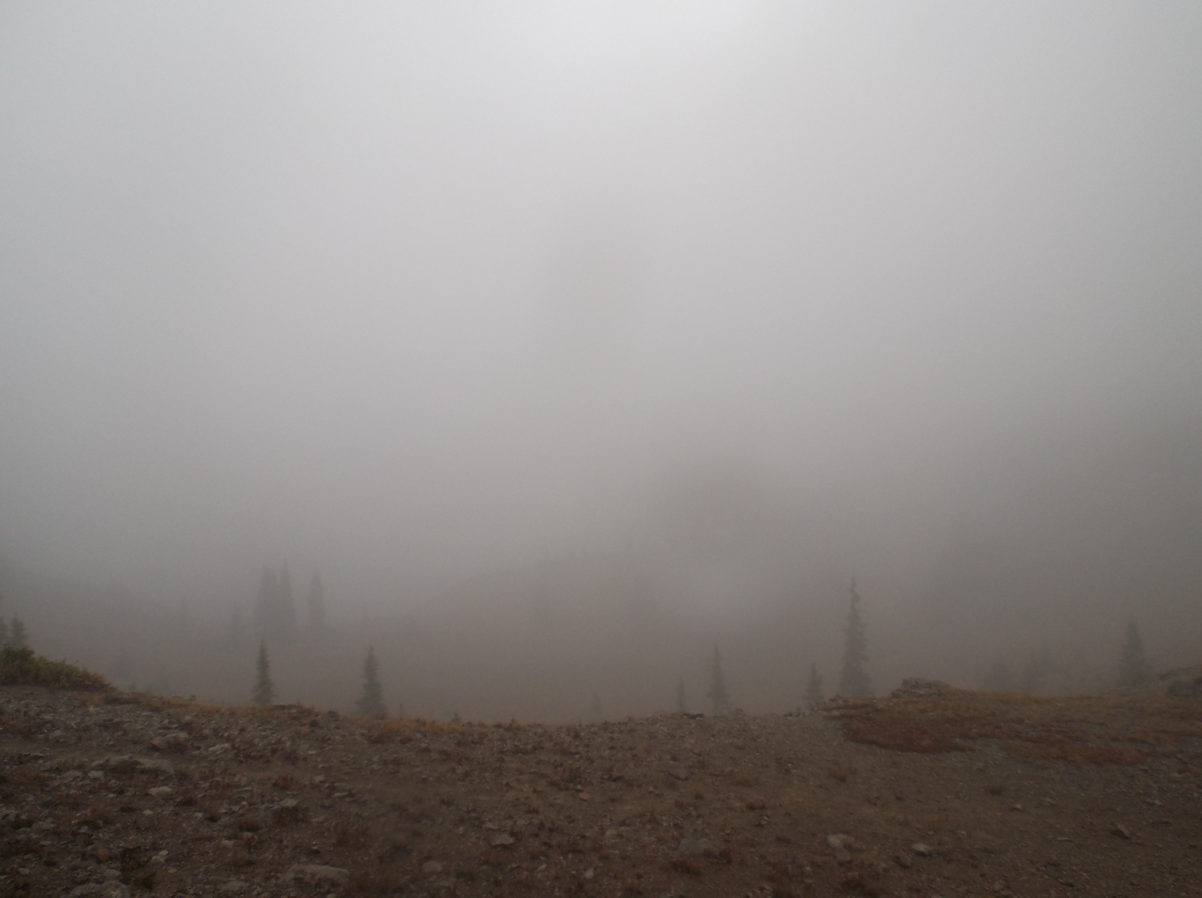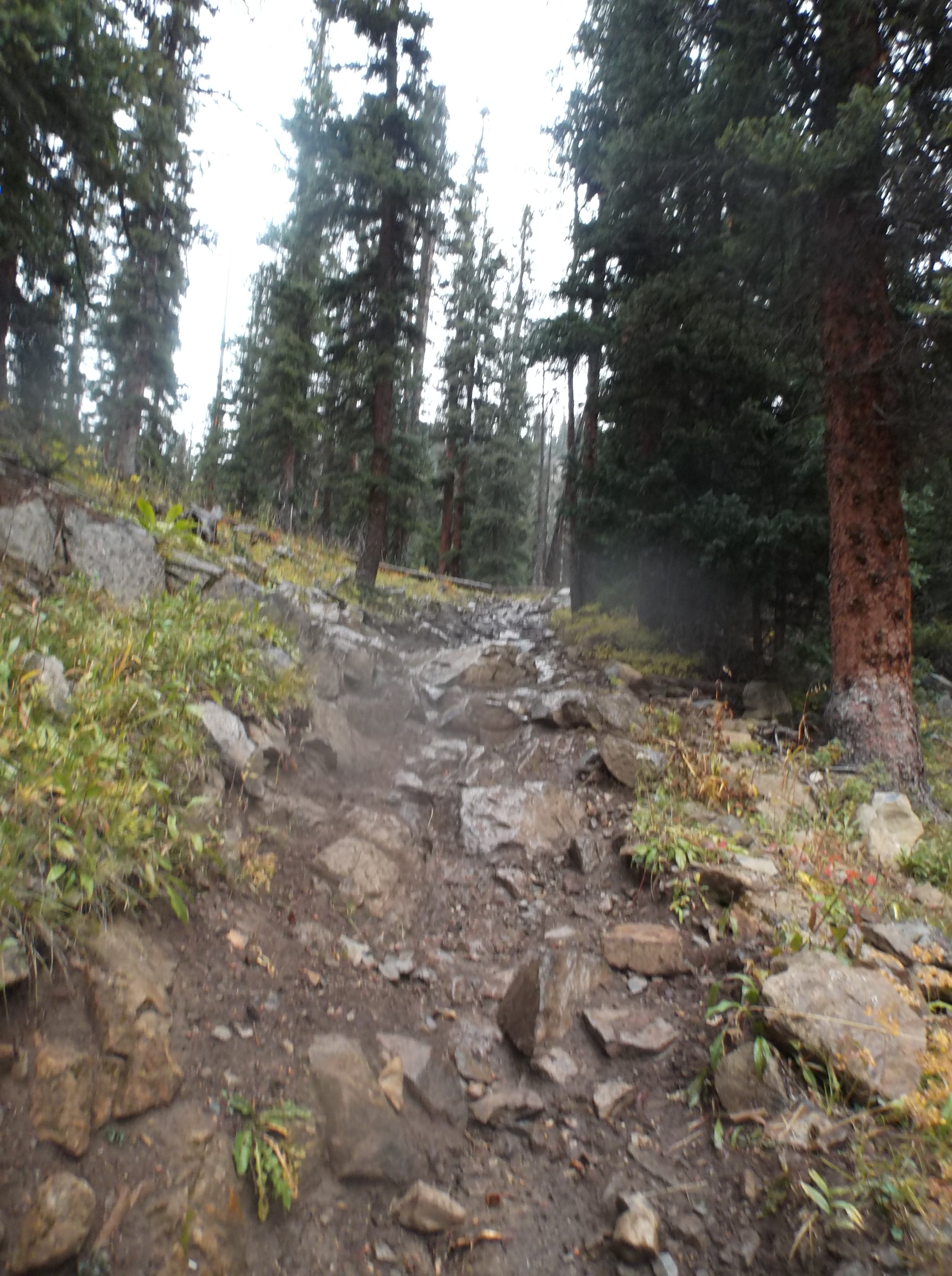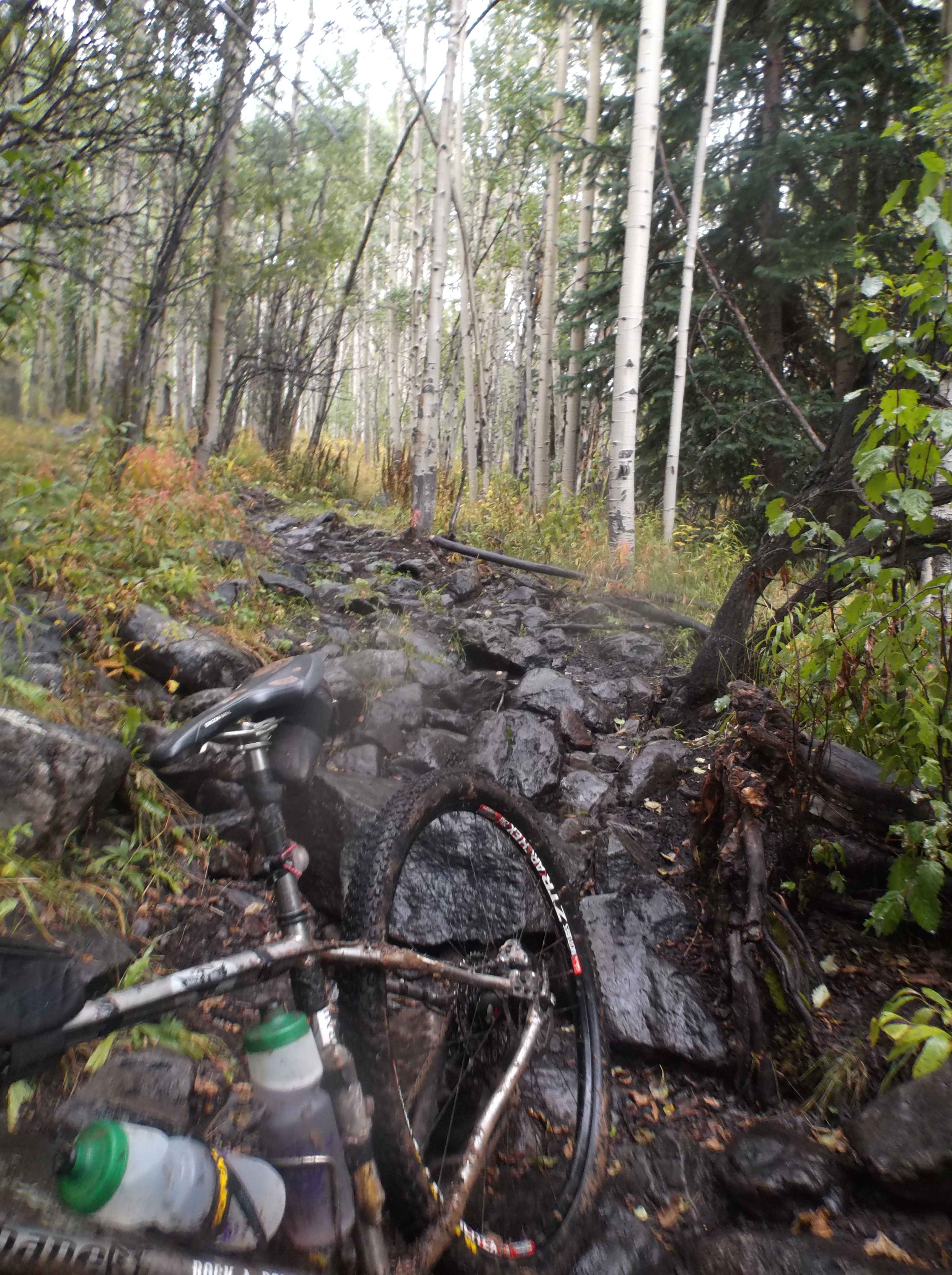Well it rains alright. The storm opens up into a steady downpour as I break treeline. The clay in the soil turns to gumbo mud, I am barely able to ride here and there. But at 11-12,000′, with mud ladened tires, wet rocks and my tired legs, it ends up that a healthy bit of walking gets me across the high traverse. I come to my option for bailing out, straight down a jeep road to pavement. I don’t stop or even flinch, “have faith Jefe” I mumble and keep going.