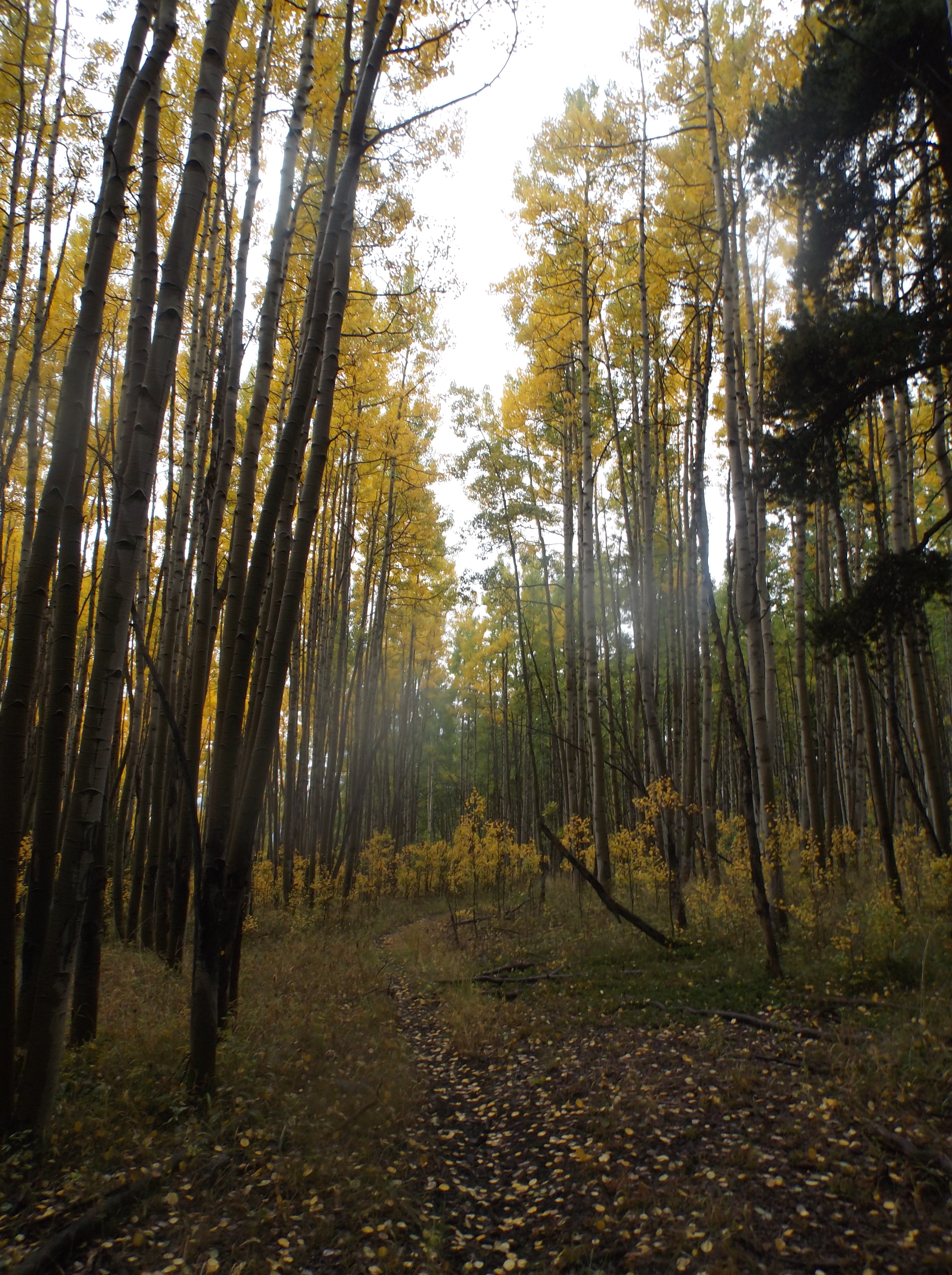 The rain eases up, the soil changes and no longer sticks to my bike. The rocks and roots are still plentiful and slick as ever, but it is so much fun to try and ride. I scare myself, nearly going over the bars a few times and sliding all over the place. Still I surprise myself at how much of it my tires flow up and over. With much love of this place, I smile as the familiar trail winds along, so many rides, years and years of adventures flash in my eyes. Cornering through the Jedi aspens, golden leaves paving the trail, one rock garden after another. Spinning, grunting, slipping, laughing with only the forest for company.