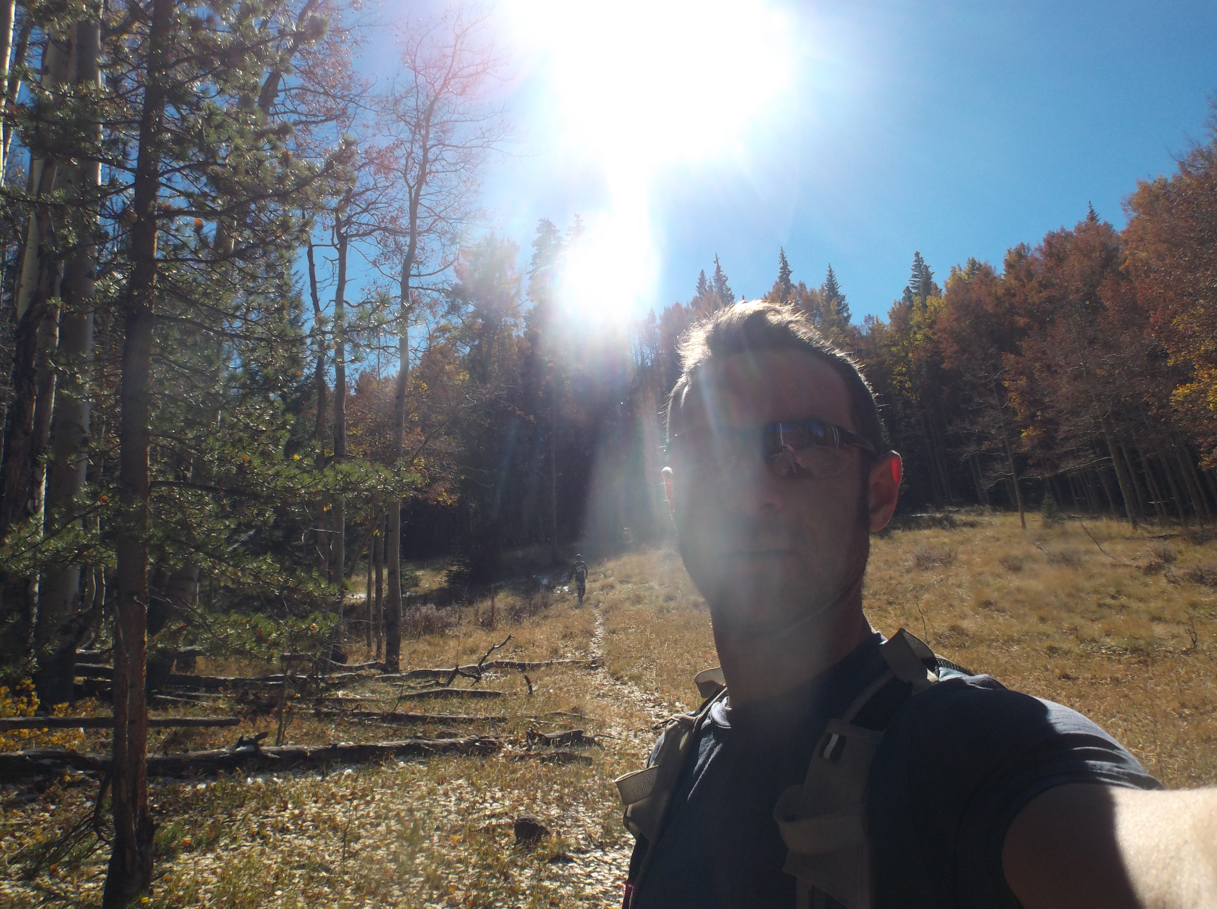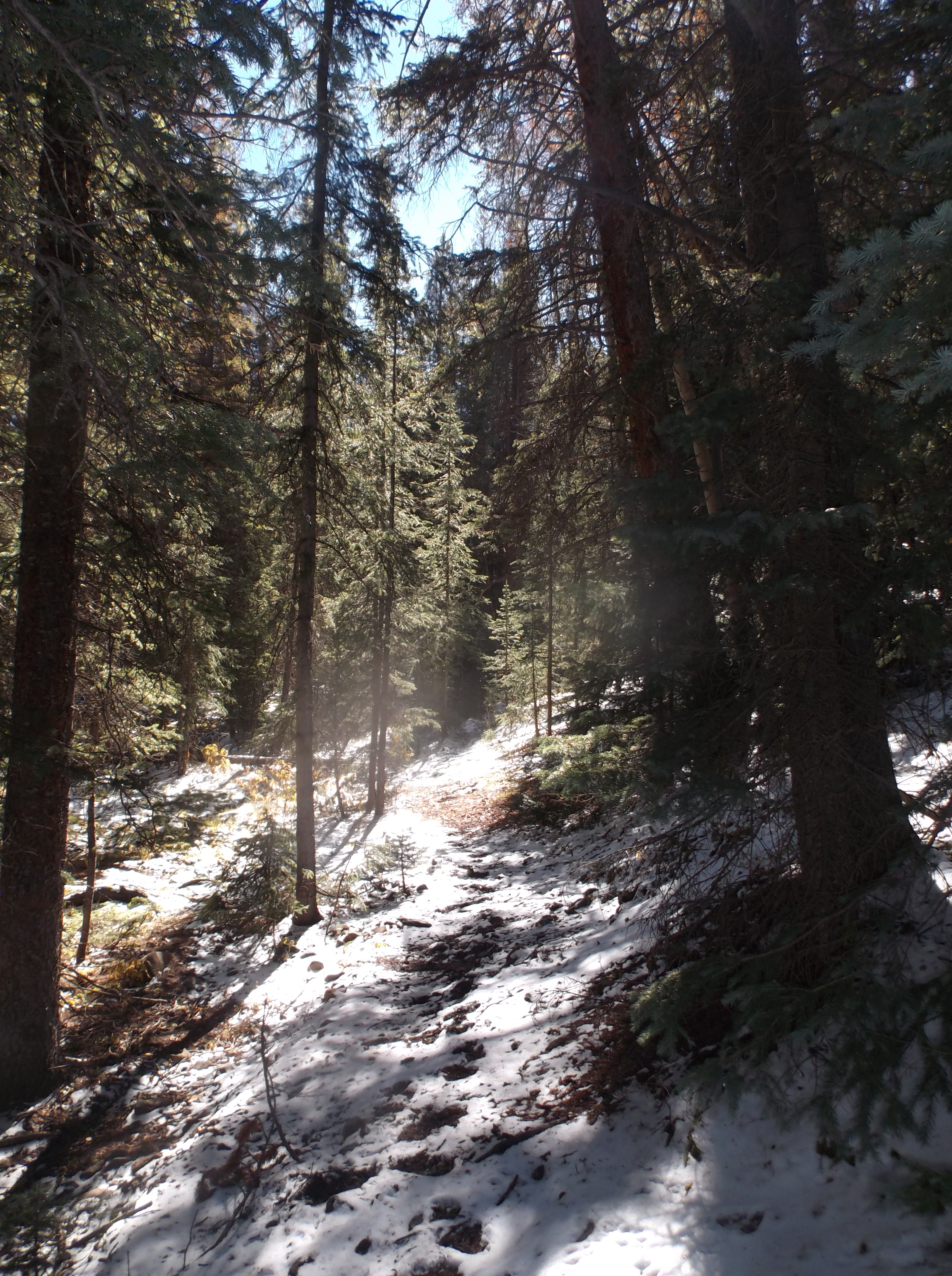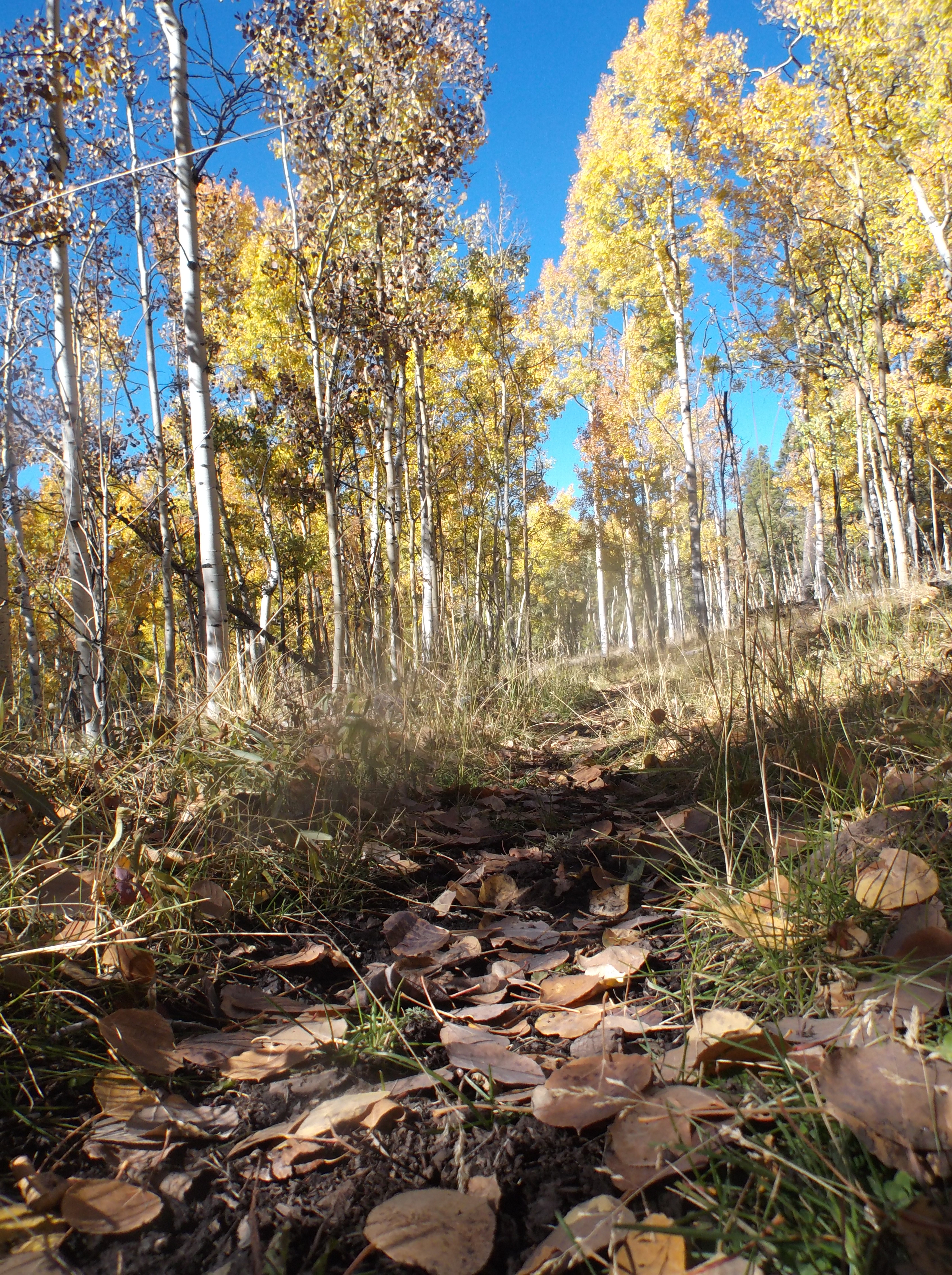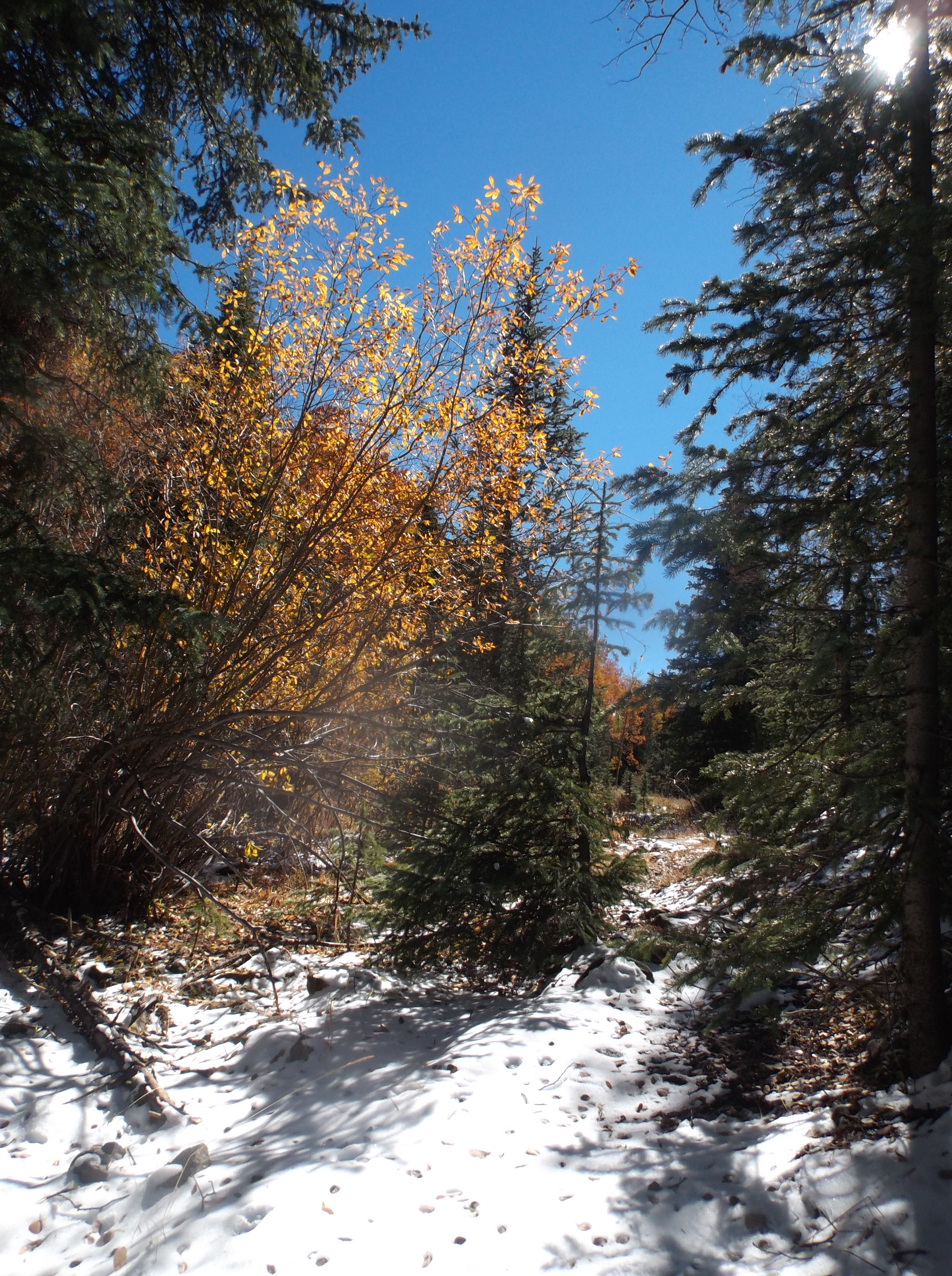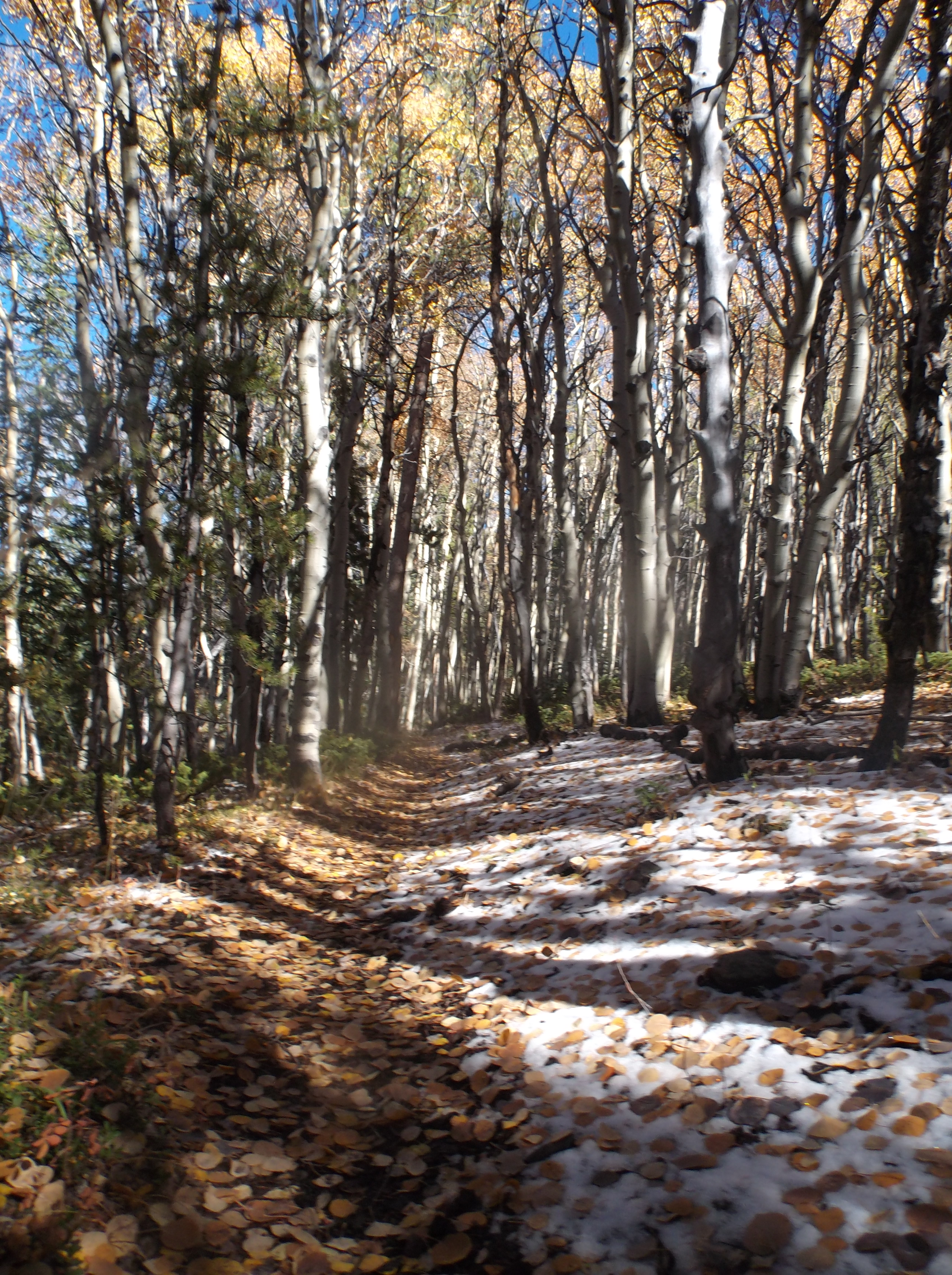 This morning I was off to see the wizard, the wonderful wizard of Gunny. My plan was not the lingering camping trip, but doing it on the quick. Ride to Soldier’s Park, hike up to the top and run/hike back to the bike, ride home. I somehow got SamJ to come along. The morning starts cold and crisp, but not painfully so. The ride up out of town is steady and long, with a few steep bursts of climbing keeping the blood pumping and the body warm. After 19 miles it is time to hide the bikes and start hiking. The sky is solid blue, not a cloud to be seen. The aspens are glowing gold, yellow, orange and red, there is some variable snow cover on north aspects and in shady spots. The contrast is spectacular, it is simply an amazing day.