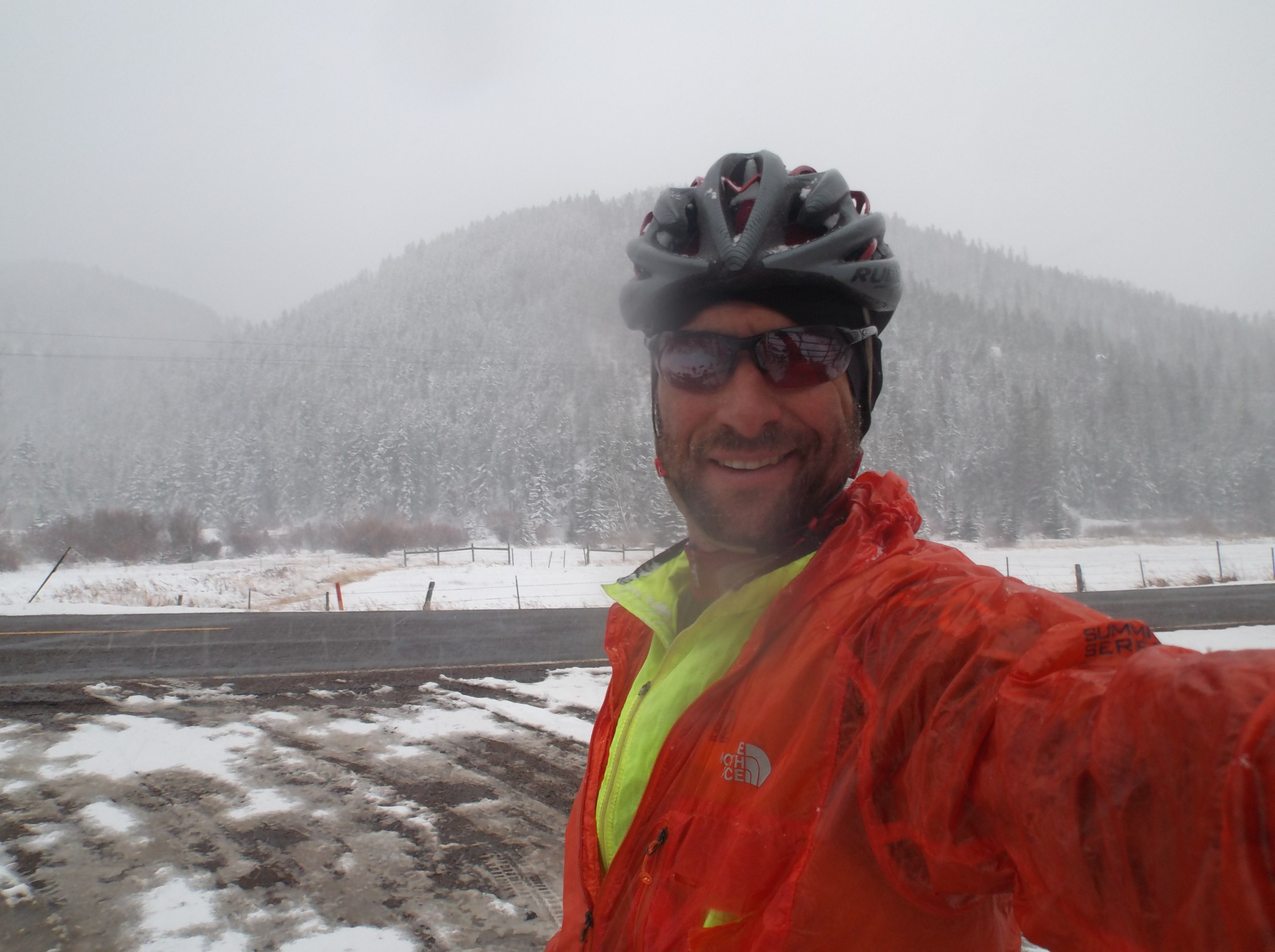 The weather starts out fine, cool, cloudy, touch of wet pavement here and there. I roll east on Hwy 50, feeling great, smiling having fun cruising along. I peal off the highway at Parlin as bits of snow begin to cascade on down across the picturesque ranching valley. I make it to Ohio City, the road is still pretty clear and dry. I keep rolling with the intent of turning around at Pitkin. Soon as I leave Ohio City the wind begins drive the snow sideways, bringing a sting to the precipitation. Still I pedal on. Soon the road begins to hold snow, a bit here and there, then an inch, then a couple inches. Suddenly my back tire is slipping out when I stand up. Visibility is getting to be down right sketchy, Ok time to turn around.