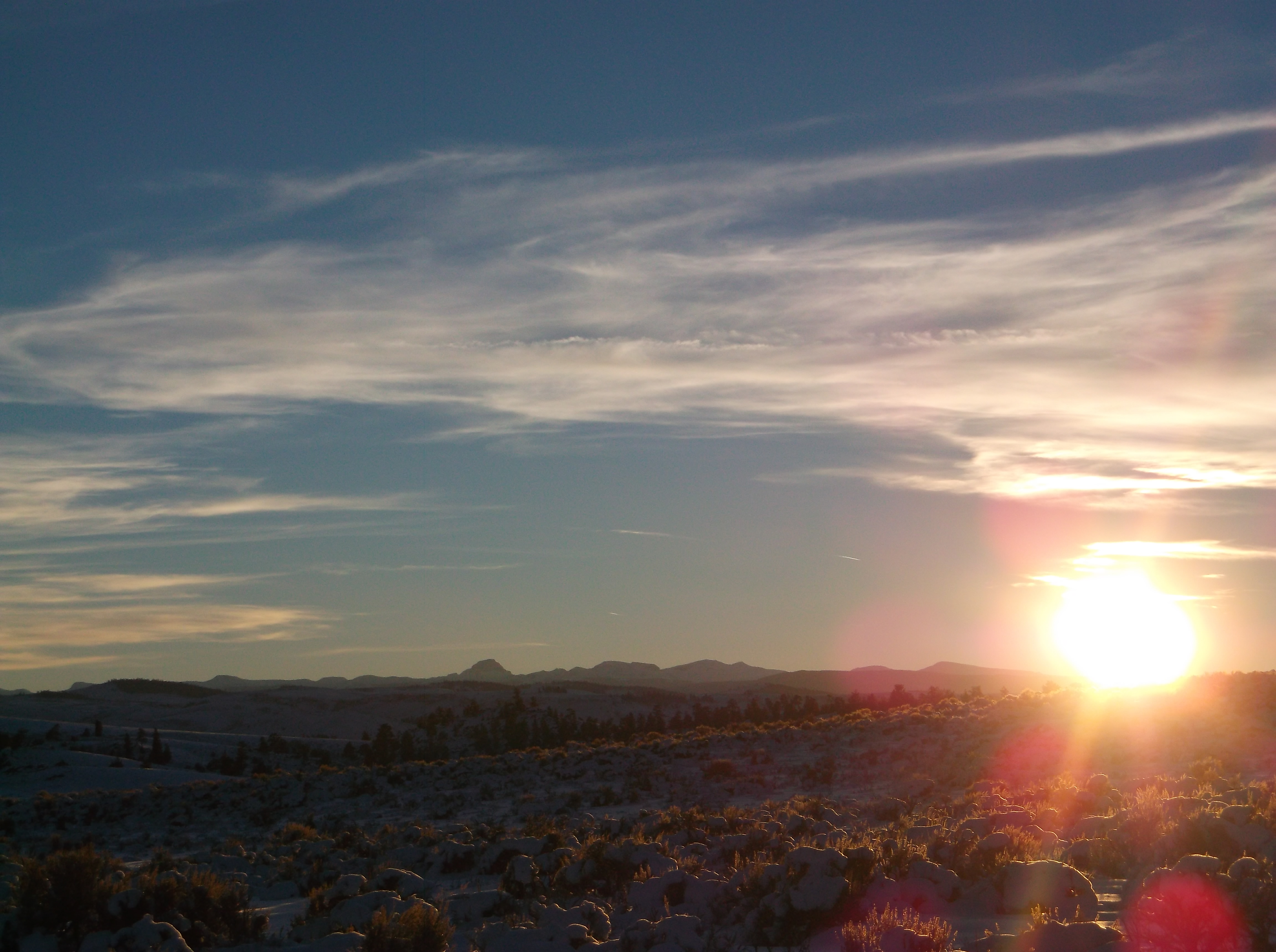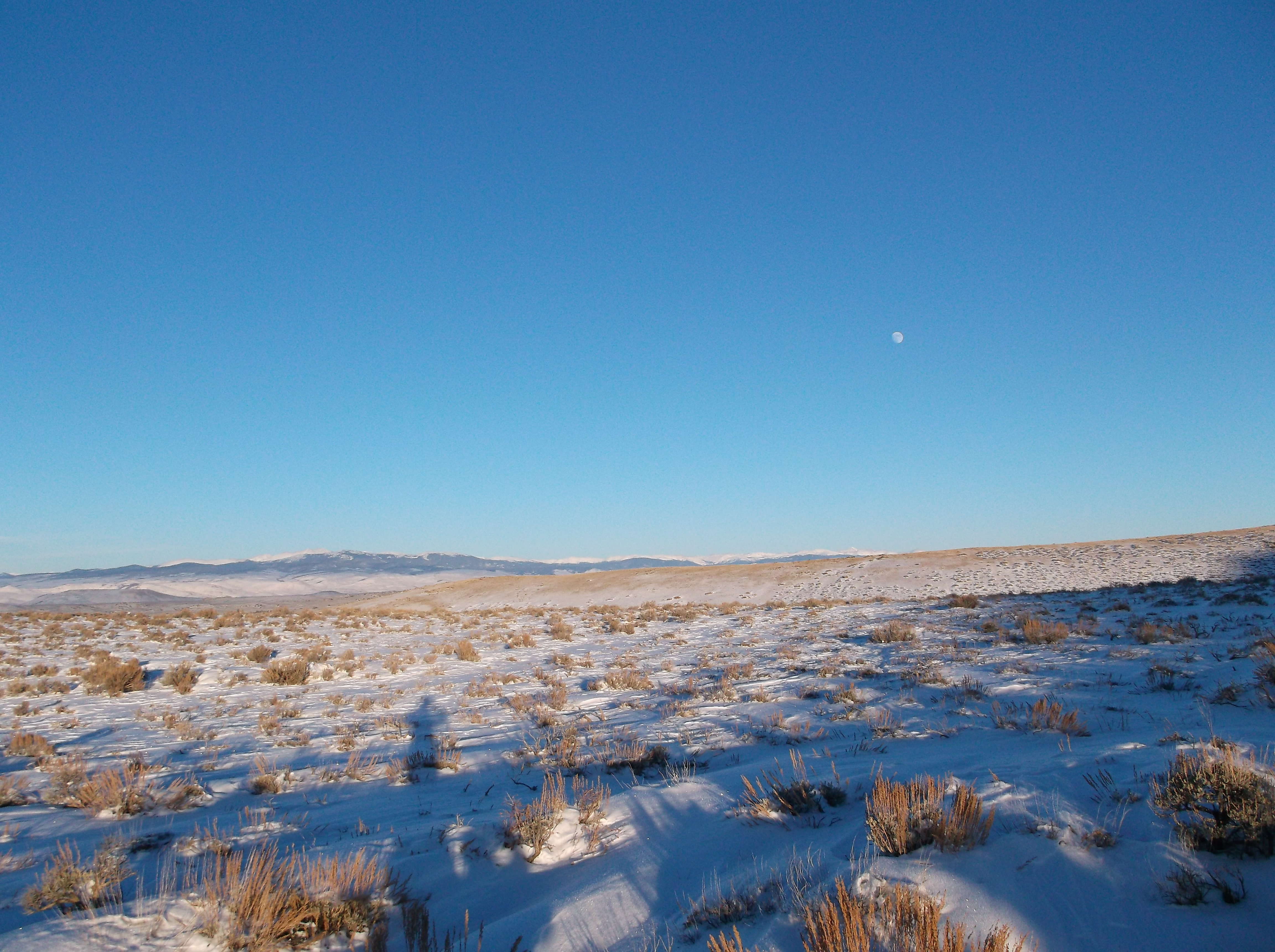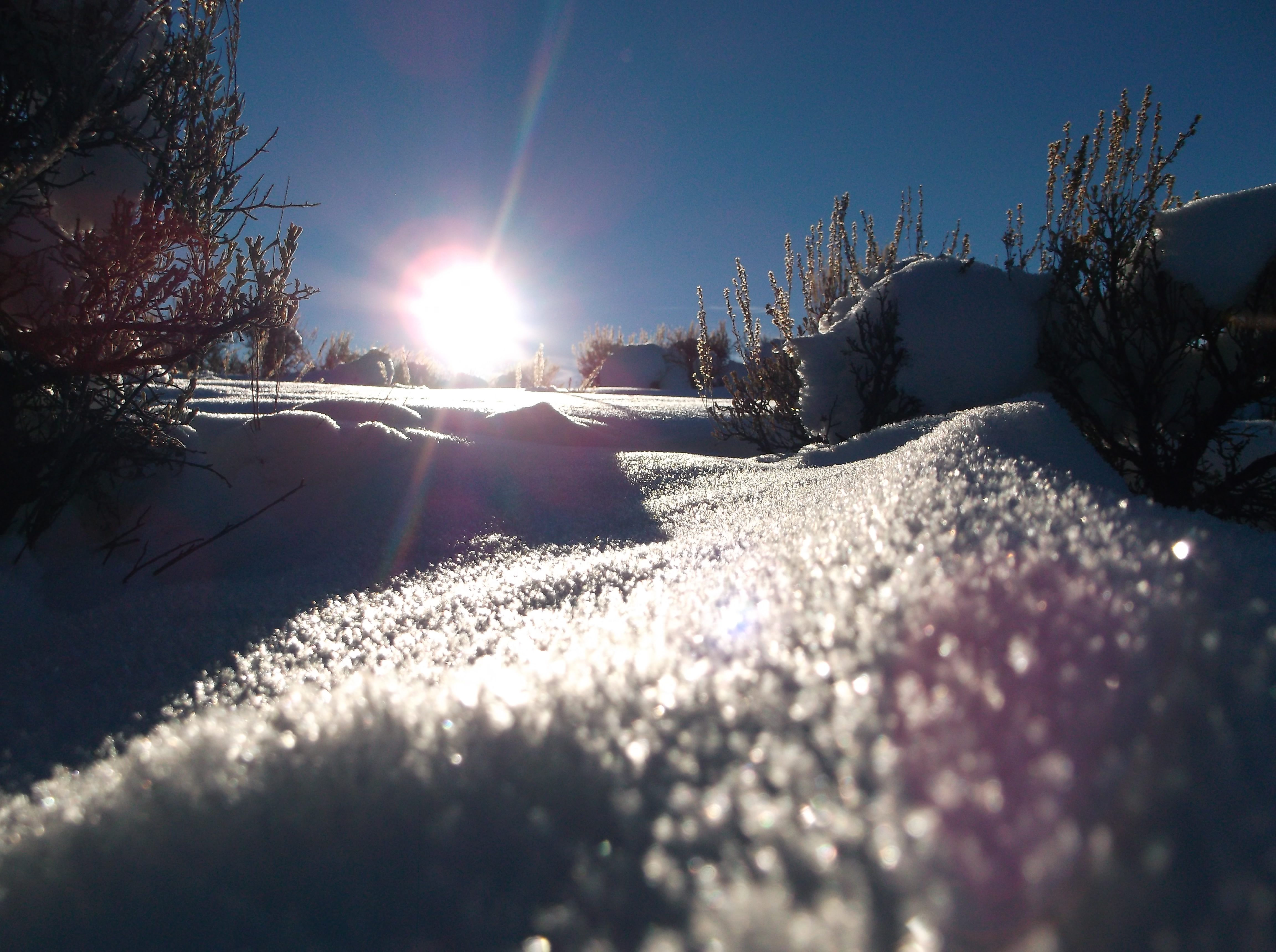 Sun affected snow formed giant hoar frost crystals across fields of sage stretching for miles and miles.