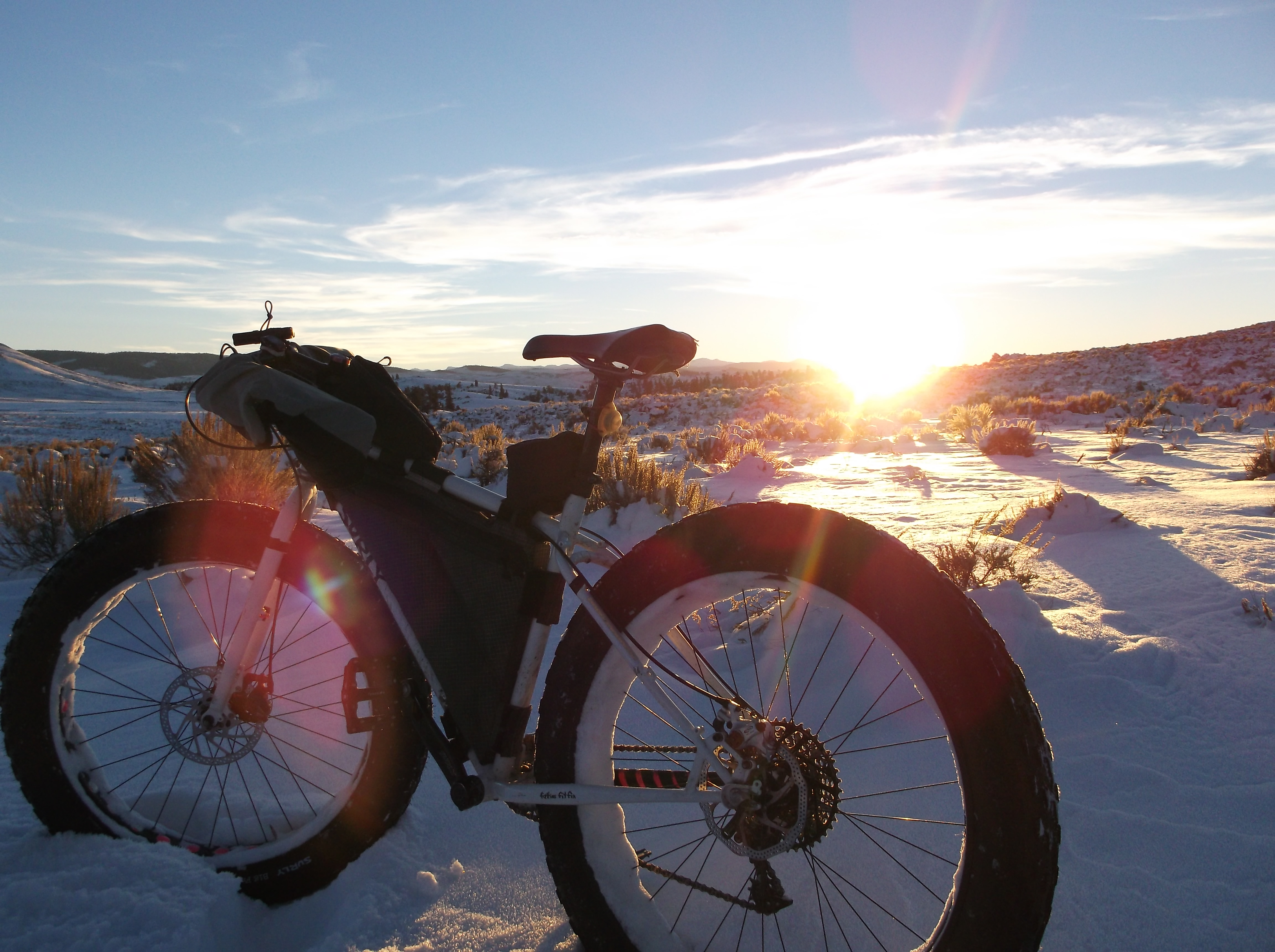 Went out for a snow bike ride. All by myself. Plenty of tire tracks to ride. Lots and lots of bunnies scurrying to and fro. One very large golden eagle sitting atop a huge Dug Fir. Deer, elk, rabbit and coyote tracks crisscrossed the road seemingly everywhere.