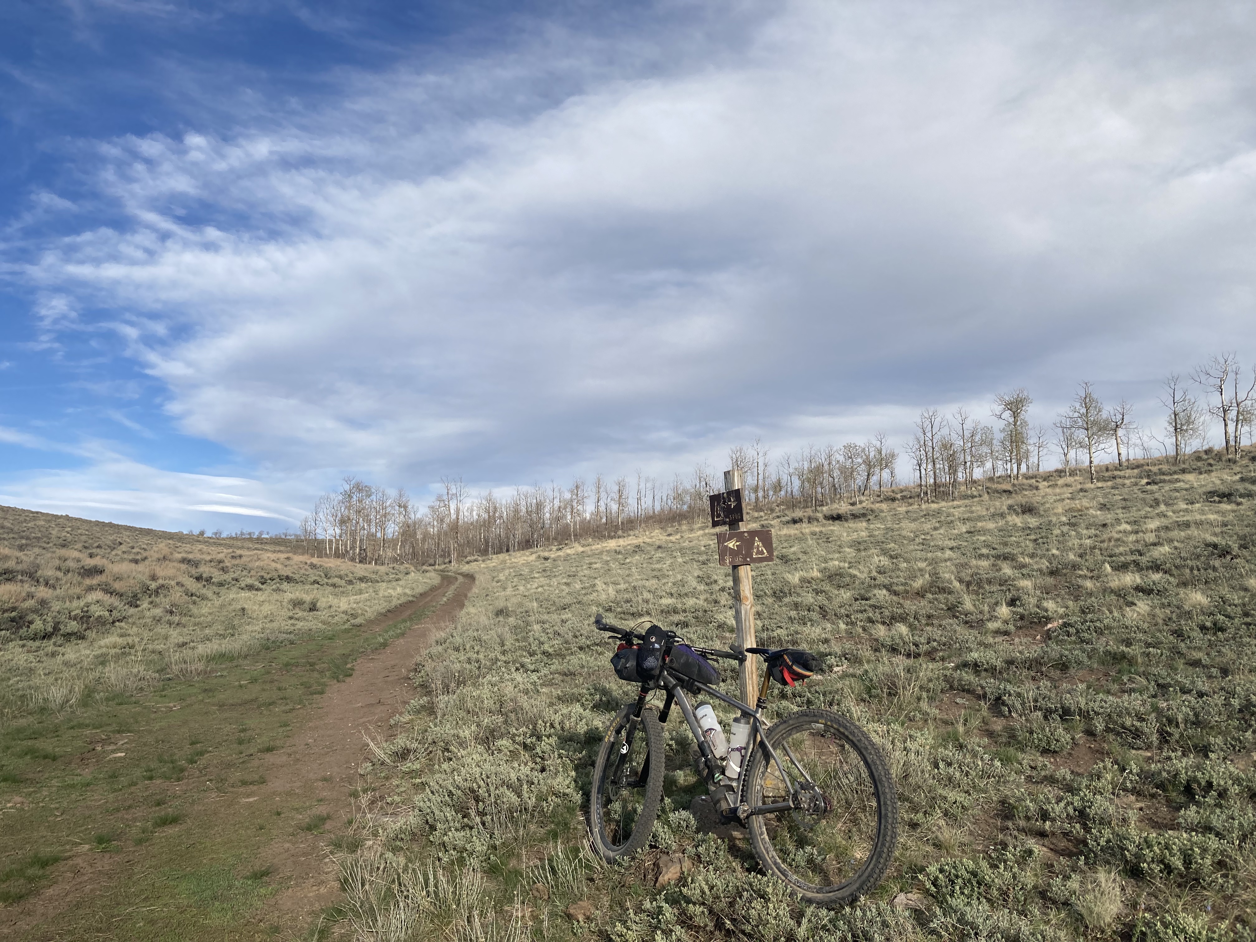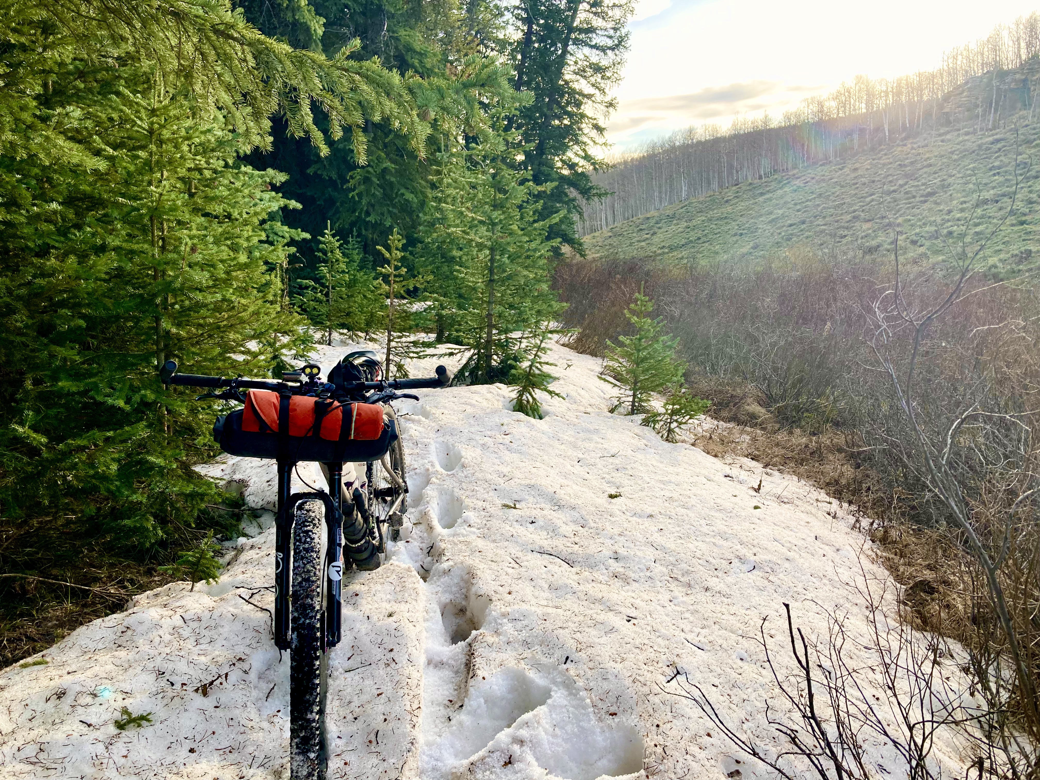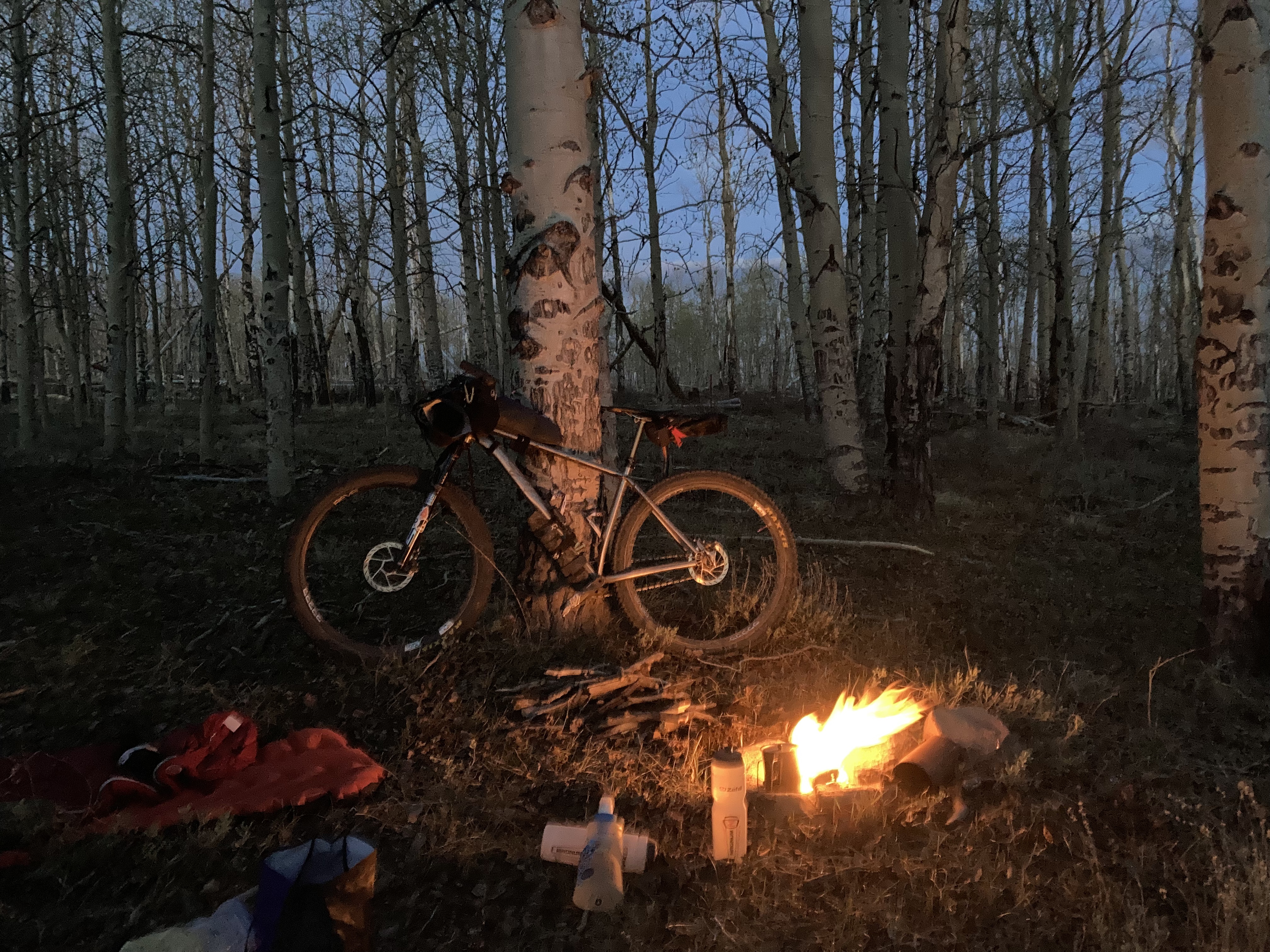 After just 2 hours of pushing and pedaling I was getting into the aspens, most of our spring riding season we are kept in the sage for wildlife closures and it is always special to get up into the forests. Flittering in between sage, aspens, and dark timber, is a magical zone that I cherish. There was water flowing, a few patches of snow in the deeper trees, barely any human tracks to be seen. Elk jumped away at the sound of my shuffling feet, grouse fluttered and grumped as the sun slowly set. I had no where to get to, no destination in mind, I was just wandering about loosely looking for a place to camp. I walked about watching the elk and then moved on, giving the elk a bit more space, finding a nice spot in a stand of aspens.